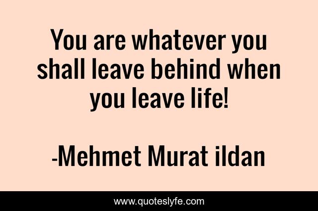This page presents the quote "You are whatever you shall leave behind when you leave life!". Author of this quote is Mehmet Murat ildan. This quote is about who-are-you, life, mehmet-murat-ildan, leave-behind, life-and-sayings, leave, behind, who-are-you-really,.