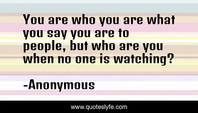 This page presents the quote "You are who you are what you say you are to people, but who are you when no one is watching?". Author of this quote is Anonymous. This quote is about humanity-and-society, philosophy-of-life, society-s-increasing-stupidity,.