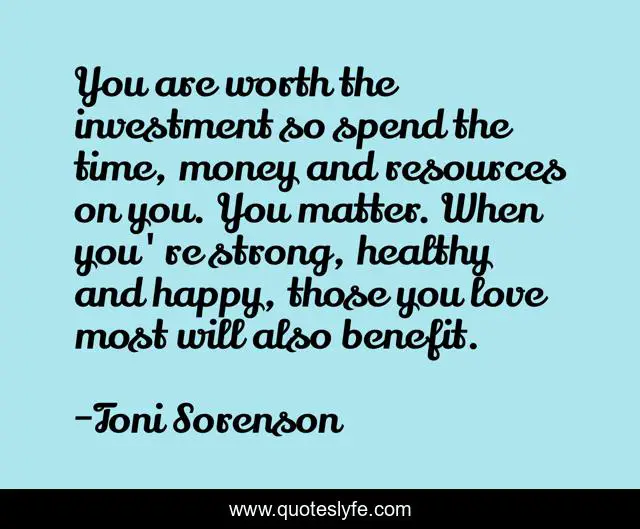 This page presents the quote "You are worth the investment so spend the time, money and resources on you. You matter. When you're strong, healthy and happy, those you love most will also benefit.". Author of this quote is Toni Sorenson. This quote is about life, love, affection, self-worth,.