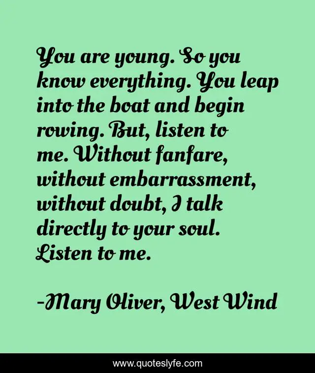 This page presents the quote "You are young. So you know everything. You leap into the boat and begin rowing. But, listen to me. Without fanfare, without embarrassment, without doubt, I talk directly to your soul. Listen to me.". Author of this quote is Mary Oliver, West Wind. This quote is about youth, trust, knowledge, pure,.
