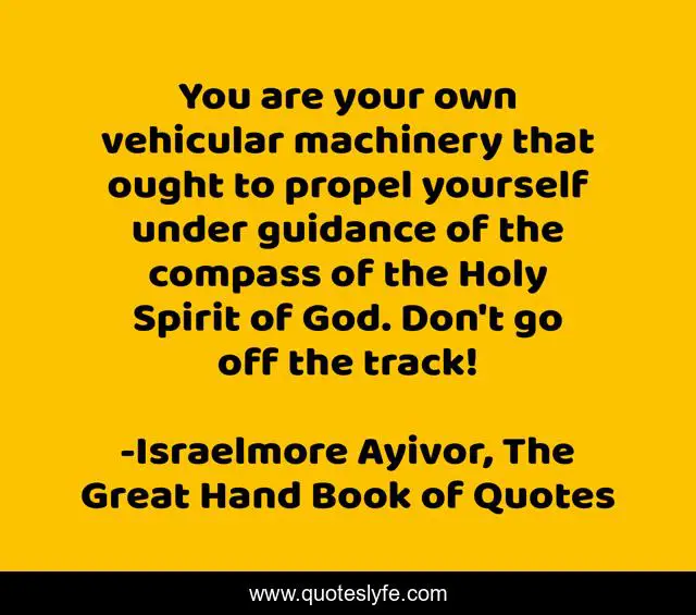 This page presents the quote "You are your own vehicular machinery that ought to propel yourself under guidance of the compass of the Holy Spirit of God. Don't go off the track!". Author of this quote is Israelmore Ayivor, The Great Hand Book of Quotes. This quote is about jesus-christ, jehovah, propel, move, off-track, jesus, god-is-love, god-is-good, food-for-thought,.