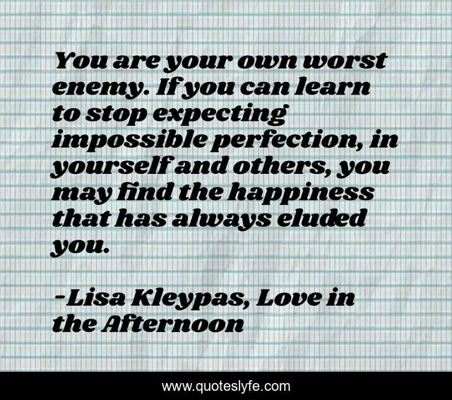 This page presents the quote "You are your own worst enemy. If you can learn to stop expecting impossible perfection, in yourself and others, you may find the happiness that has always eluded you.". Author of this quote is Lisa Kleypas, Love in the Afternoon. This quote is about enemy, expectations,.