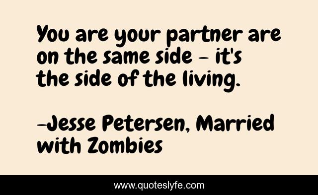 This page presents the quote "You are your partner are on the same side - it's the side of the living.". Author of this quote is Jesse Petersen, Married with Zombies. This quote is about marriage-advice, humor, zombies,.