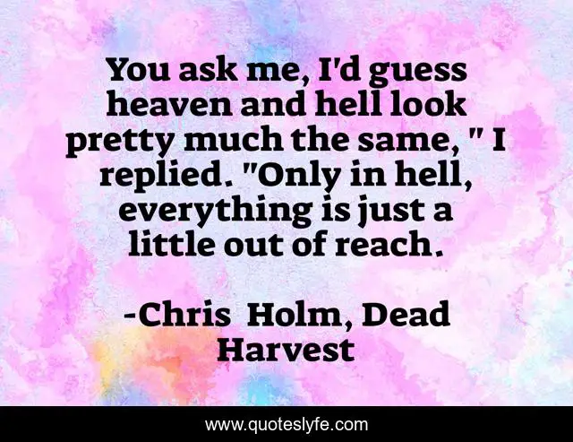 This page presents the quote "You ask me, I'd guess heaven and hell look pretty much the same, " I replied. "Only in hell, everything is just a little out of reach.". Author of this quote is Chris Holm, Dead Harvest. This quote is about hell, heaven, philosophy, religion,.