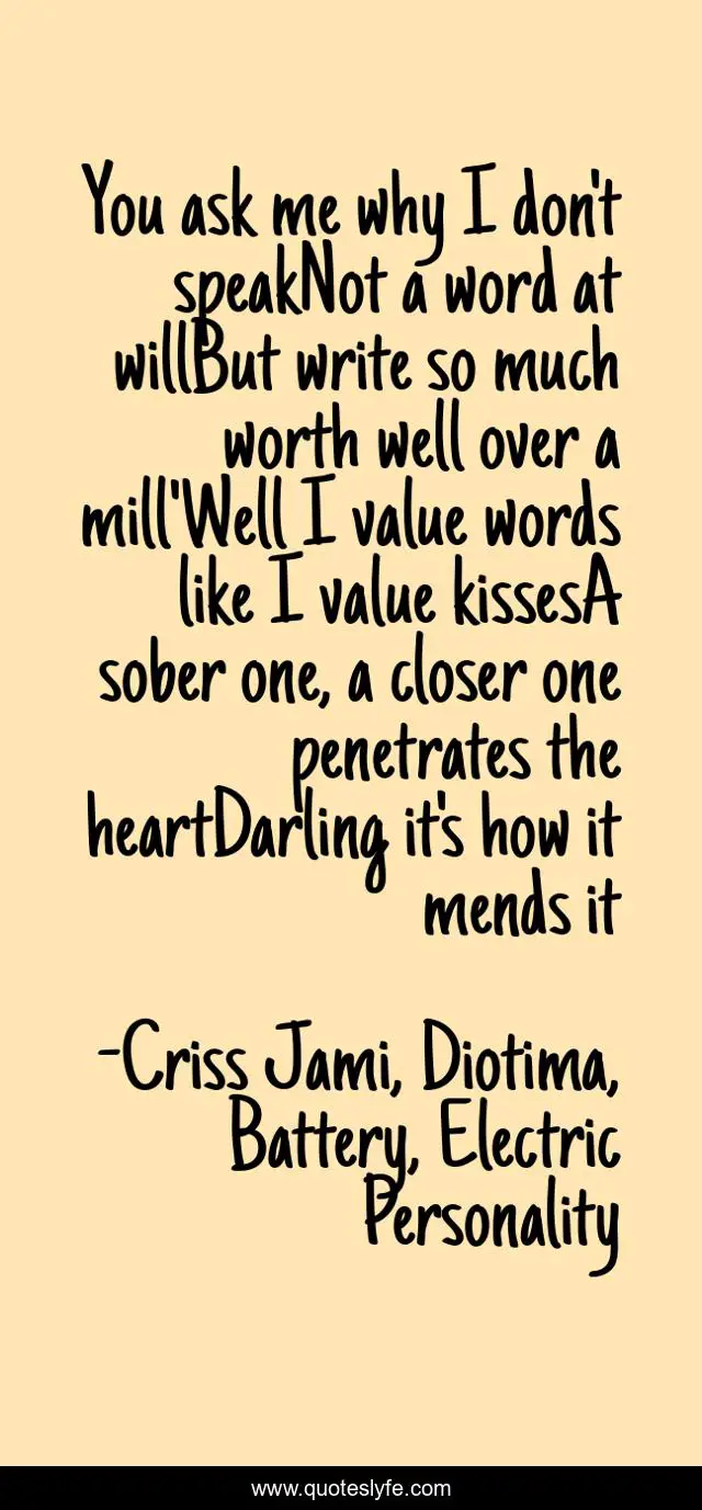 This page presents the quote "You ask me why I don't speakNot a word at willBut write so much worth well over a mill'Well I value words like I value kissesA sober one, a closer one penetrates the heartDarling it's how it mends it". Author of this quote is Criss Jami, Diotima, Battery, Electric Personality. This quote is about beautiful, poem, love, beauty, lyrics, prudence, rhyme, poetry, value,.