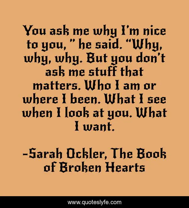 This page presents the quote "You ask me why I’m nice to you, ” he said. “Why, why, why. But you don’t ask me stuff that matters. Who I am or where I been. What I see when I look at you. What I want.". Author of this quote is Sarah Ockler, The Book of Broken Hearts. This quote is about romance, love, young-adult, affection,.