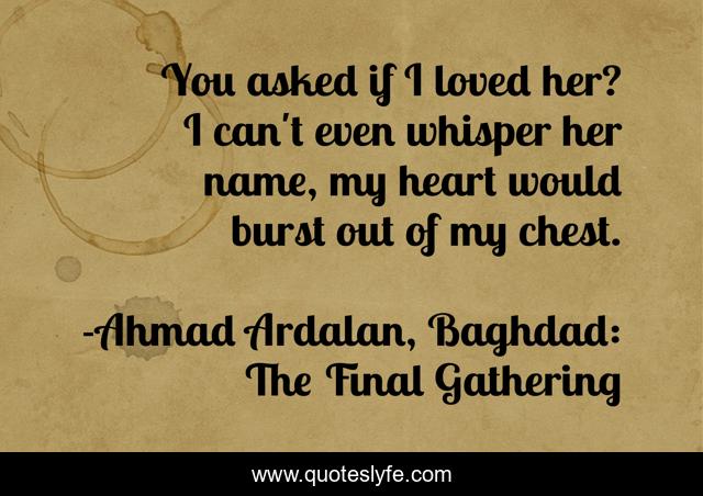 This page presents the quote "You asked if I loved her? I can't even whisper her name, my heart would burst out of my chest.". Author of this quote is Ahmad Ardalan, Baghdad: The Final Gathering. This quote is about love, ahmad-ardalan, romantic, historical-romance, romance, patience, baghdad, passion, hope,.