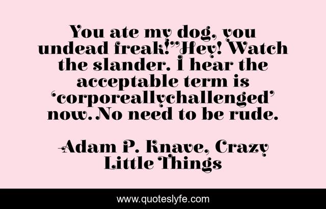 This page presents the quote "You ate my dog, you undead freak!”Hey! Watch the slander. I hear the acceptable term is ‘corporeallychallenged’ now. No need to be rude.". Author of this quote is Adam P. Knave, Crazy Little Things. This quote is about zombie, horror, adam-p-knave,.