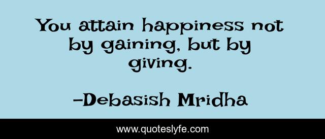 This page presents the quote "You attain happiness not by gaining, but by giving.". Author of this quote is Debasish Mridha. This quote is about gaining, life, love, knowledge, giving, intelligence, philosophy, wisdom, inspirational,.