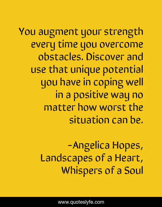 This page presents the quote "You augment your strength every time you overcome obstacles. Discover and use that unique potential you have in coping well in a positive way no matter how worst the situation can be.". Author of this quote is Angelica Hopes, Landscapes of a Heart, Whispers of a Soul. This quote is about life, strength, potential, optimism, obstacles,.