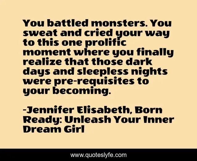 "Jennifer Elisabeth, Born Ready: Unleash Your Inner Dream Girl Quotes." Quoteslyfe.com, 2025. Mon. 08 Dec. 2025. <https://www.quoteslyfe.com/quote/You-battled-monsters-You-sweat-and-cried-100950>.