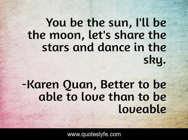 This page presents the quote "You be the sun, I'll be the moon, let's share the stars and dance in the sky.". Author of this quote is Karen Quan, Better to be able to love than to be loveable. This quote is about relationships, romantic, dancing, dance, sun, sky, moon, romance, stars,.