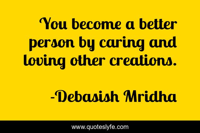 This page presents the quote "You become a better person by caring and loving other creations.". Author of this quote is Debasish Mridha. This quote is about philosophy, caring-and-loving, debasish-mridha, quotes, how-to-be-a-better-person, loving-other-creations, debasish-mridha-md, inspirational, enthusiasm,.