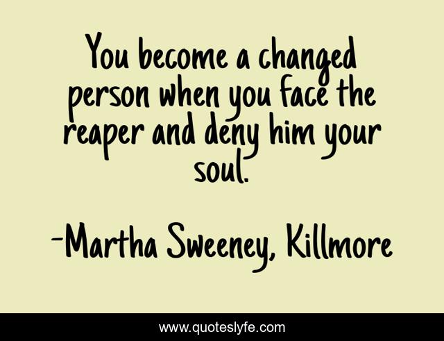 This page presents the quote "You become a changed person when you face the reaper and deny him your soul.". Author of this quote is Martha Sweeney, Killmore. This quote is about death, reaper, killmore, grim-reaper, death-and-dying, change,.