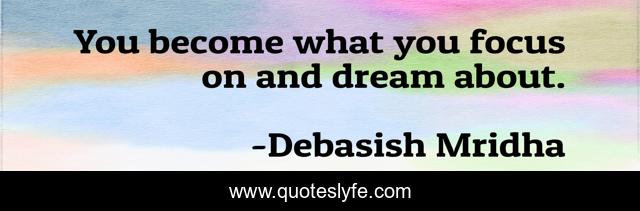 This page presents the quote "You become what you focus on and dream about.". Author of this quote is Debasish Mridha. This quote is about what-you-become, philosophy, debasish-mridha, focus, quotes, inspirational, enthusiasm, debasish-mridha-m-d, dreams,.