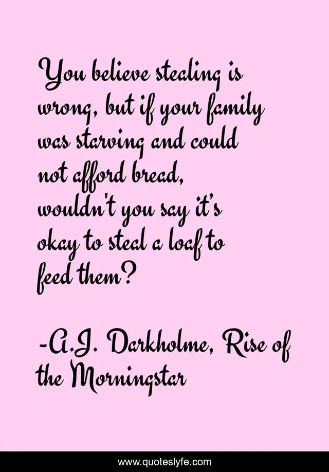 "A.J. Darkholme, Rise of the Morningstar Quotes." Quoteslyfe.com, 2025. Sat. 06 Dec. 2025. <https://www.quoteslyfe.com/quote/You-believe-stealing-is-wrong-but-if-164094>.