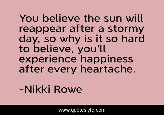 This page presents the quote "You believe the sun will reappear after a stormy day, so why is it so hard to believe, you'll experience happiness after every heartache.". Author of this quote is Nikki Rowe. This quote is about heartache, nikki-rowe, happiness-wuotes, quote-of-the-day, guidance, meaning, quotes, quote-for-the-soul, words,.