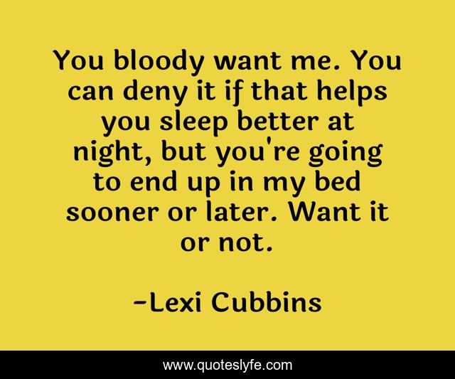 This page presents the quote "You bloody want me. You can deny it if that helps you sleep better at night, but you're going to end up in my bed sooner or later. Want it or not.". Author of this quote is Lexi Cubbins. .