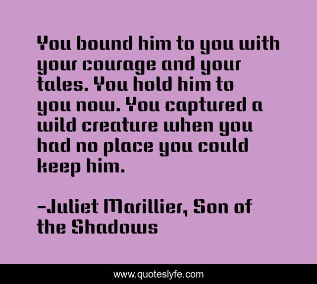 This page presents the quote "You bound him to you with your courage and your tales. You hold him to you now. You captured a wild creature when you had no place you could keep him.". Author of this quote is Juliet Marillier, Son of the Shadows. This quote is about love, storytelling, affection,.