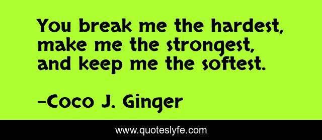 This page presents the quote "You break me the hardest, make me the strongest, and keep me the softest.". Author of this quote is Coco J. Ginger. This quote is about passions, lovers, love, love-story, breakup, i-love-you, love-and-romance, breakups, coco-j-ginger,.