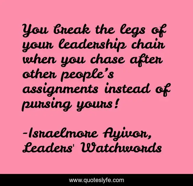 This page presents the quote "You break the legs of your leadership chair when you chase after other people’s assignments instead of pursing yours!". Author of this quote is Israelmore Ayivor, Leaders' Watchwords. This quote is about food-for-thought, leaders, lead, be-yourself, assignment, lead-people, break, leadership, follow-your-dreams,.