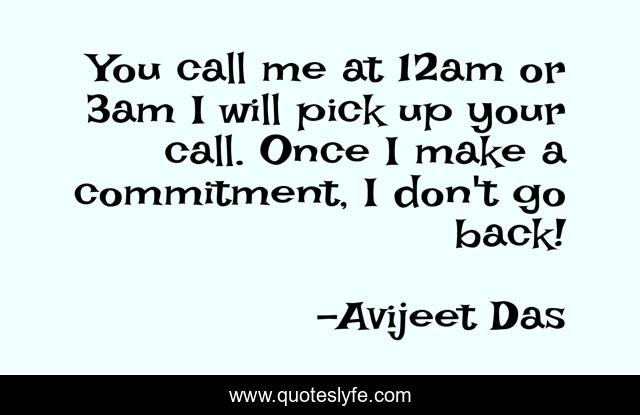 This page presents the quote "You call me at 12am or 3am I will pick up your call. Once I make a commitment, I don't go back!". Author of this quote is Avijeet Das. This quote is about life, writers-life, commitment, calling, writers, dependable, life-lessons, poet,.