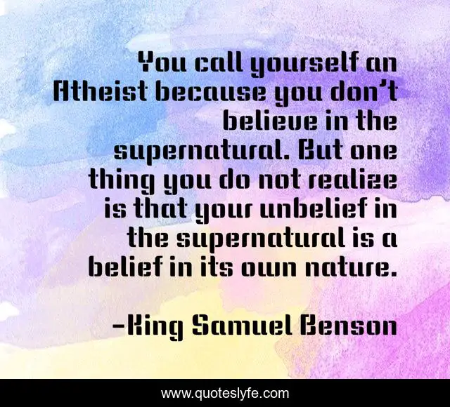 This page presents the quote "You call yourself an Atheist because you don’t believe in the supernatural. But one thing you do not realize is that your unbelief in the supernatural is a belief in its own nature.". Author of this quote is King Samuel Benson. This quote is about atheism, belief-systems,.