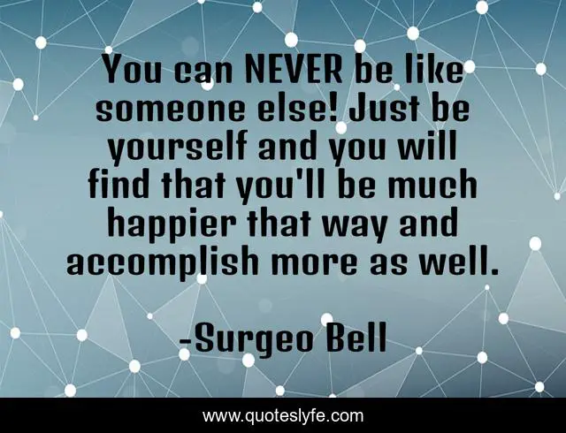 This page presents the quote "You can NEVER be like someone else! Just be yourself and you will find that you'll be much happier that way and accomplish more as well.". Author of this quote is Surgeo Bell. This quote is about love, money, making-money, respect, trust, relationships, accomplish, god, believe,.