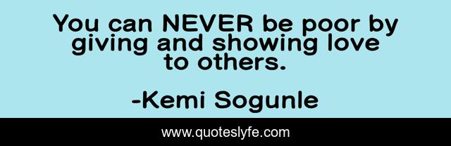 This page presents the quote "You can NEVER be poor by giving and showing love to others.". Author of this quote is Kemi Sogunle. This quote is about love, truth, giving, loving-others, inspirational, loving-someone, enthusiasm, affection, loving,.