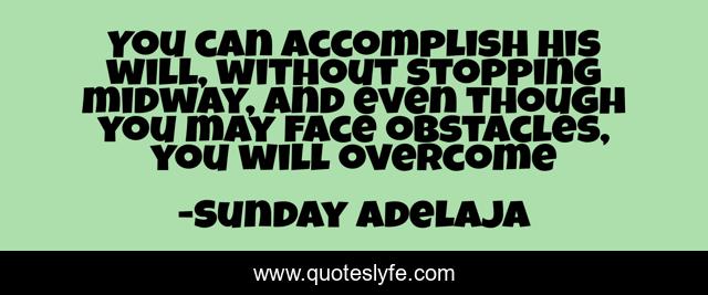 This page presents the quote "You can accomplish His will, without stopping midway, and even though you may face obstacles, you will overcome". Author of this quote is Sunday Adelaja. This quote is about accomplish, obstacles, stop, calling, purpose, overcome, fulfillment,.