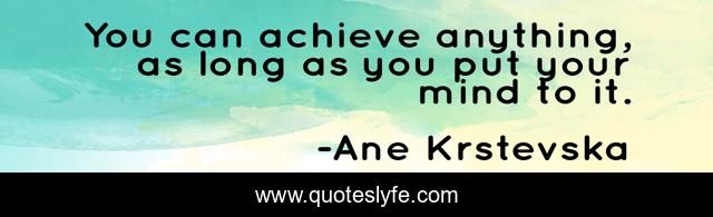 This page presents the quote "You can achieve anything, as long as you put your mind to it.". Author of this quote is Ane Krstevska. This quote is about confidence, positive, motivational, optimistic, inspirational, enthusiasm,.
