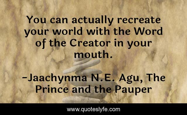 "Jaachynma N.E. Agu, The Prince and the Pauper Quotes." Quoteslyfe.com, 2025. Fri. 05 Dec. 2025. <https://www.quoteslyfe.com/quote/You-can-actually-recreate-your-world-with-32407>.