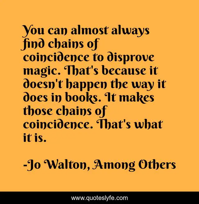 This page presents the quote "You can almost always find chains of coincidence to disprove magic. That's because it doesn't happen the way it does in books. It makes those chains of coincidence. That's what it is.". Author of this quote is Jo Walton, Among Others. .
