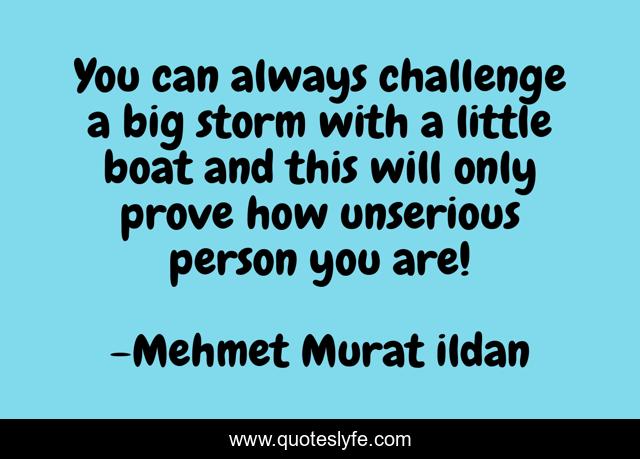 This page presents the quote "You can always challenge a big storm with a little boat and this will only prove how unserious person you are!". Author of this quote is Mehmet Murat ildan. This quote is about mehmet-murat-ildan, ildan-wise-sayings, turkish, ildan-wisdom, storms, turkish-playwrights, turkish-wisdom-words, storm, turkish-authors,.