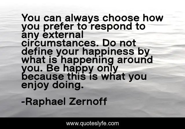 This page presents the quote "You can always choose how you prefer to respond to any external circumstances. Do not define your happiness by what is happening around you. Be happy only because this is what you enjoy doing.". Author of this quote is Raphael Zernoff. This quote is about love, responds, choice, affection, wisdom, happiness, circumstances,.
