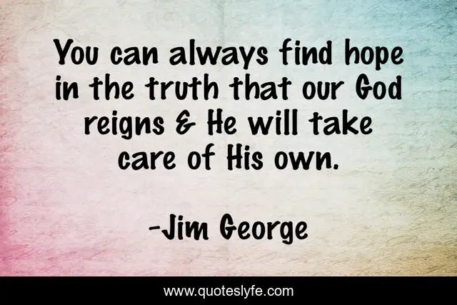 This page presents the quote "You can always find hope in the truth that our God reigns & He will take care of His own.". Author of this quote is Jim George. This quote is about faith, bible, christian, faithful, god, blessed, reigns, truth, word,.