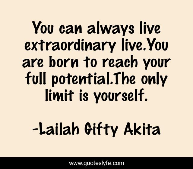 This page presents the quote "You can always live extraordinary live.You are born to reach your full potential.The only limit is yourself.". Author of this quote is Lailah Gifty Akita. This quote is about limitation, limits, potential-for-greatness, yourself, extraordinary, potential, potential-of-your-own-mind, extraordinary-individuals,.