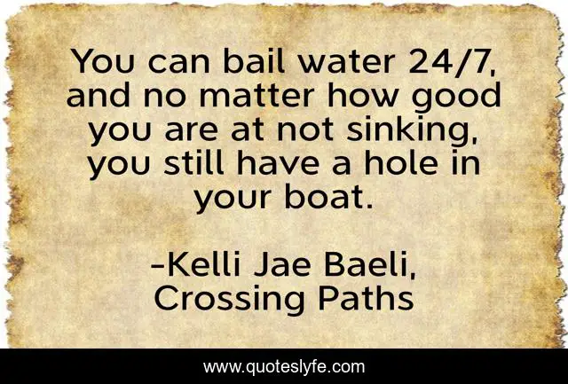 This page presents the quote "You can bail water 24/7, and no matter how good you are at not sinking, you still have a hole in your boat.". Author of this quote is Kelli Jae Baeli, Crossing Paths. This quote is about sinking, futility, wisdom, water, awareness, boat,.