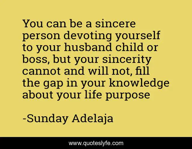 This page presents the quote "You can be a sincere person devoting yourself to your husband child or boss, but your sincerity cannot and will not, fill the gap in your knowledge about your life purpose". Author of this quote is Sunday Adelaja. This quote is about life, knowledge, people, boss, purpose, child, devotion,.