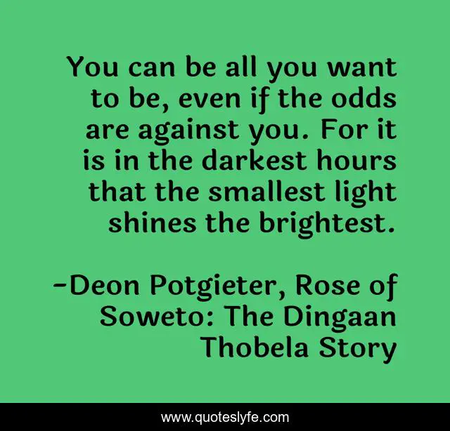 This page presents the quote "You can be all you want to be, even if the odds are against you. For it is in the darkest hours that the smallest light shines the brightest.". Author of this quote is Deon Potgieter, Rose of Soweto: The Dingaan Thobela Story. This quote is about motivational-inspirational, inspirational, enthusiasm,.