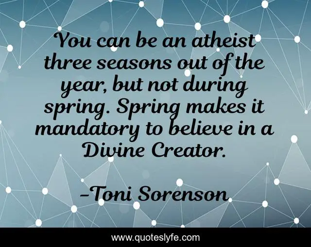 This page presents the quote "You can be an atheist three seasons out of the year, but not during spring. Spring makes it mandatory to believe in a Divine Creator.". Author of this quote is Toni Sorenson. This quote is about spring, life, inspiration, belief, faith,.