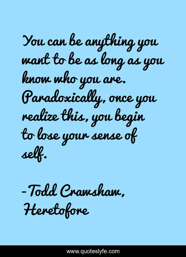 This page presents the quote "You can be anything you want to be as long as you know who you are. Paradoxically, once you realize this, you begin to lose your sense of self.". Author of this quote is Todd Crawshaw, Heretofore. This quote is about life, love, existence, zen, reality, inspirational, time, enthusiasm, affection,.