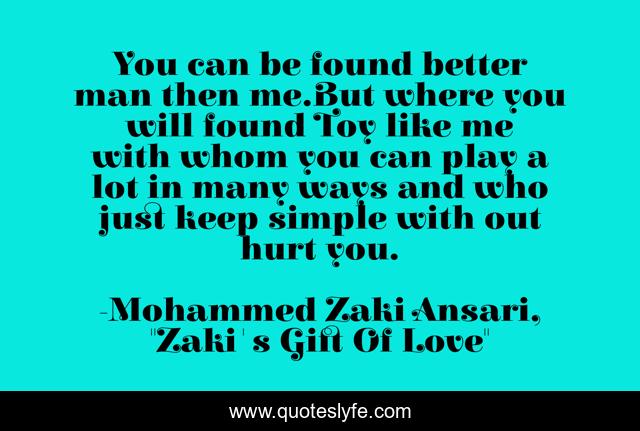 This page presents the quote "You can be found better man then me.But where you will found Toy like me with whom you can play a lot in many ways and who just keep simple with out hurt you.". Author of this quote is Mohammed Zaki Ansari, "Zaki's Gift Of Love". This quote is about betrayal, life, cheating, love, affection,.