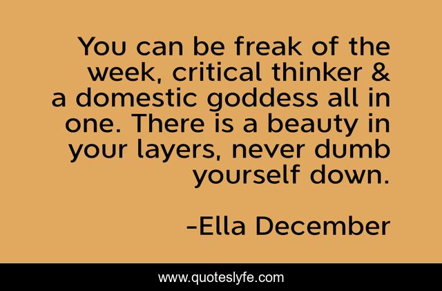 This page presents the quote "You can be freak of the week, critical thinker & a domestic goddess all in one. There is a beauty in your layers, never dumb yourself down.". Author of this quote is Ella December. This quote is about womanist, ella-december, feminism, women,.