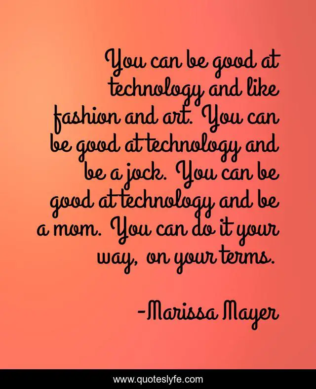 This page presents the quote "You can be good at technology and like fashion and art. You can be good at technology and be a jock. You can be good at technology and be a mom. You can do it your way, on your terms.". Author of this quote is Marissa Mayer. This quote is about good, art, mom,.