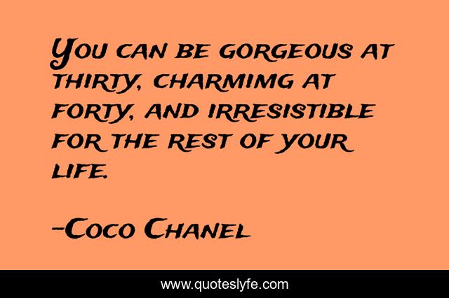 This page presents the quote "You can be gorgeous at thirty, charmimg at forty, and irresistible for the rest of your life.". Author of this quote is Coco Chanel. .