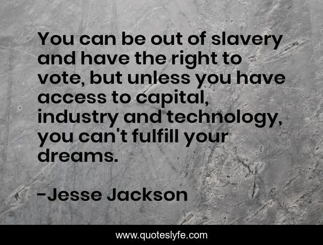 This page presents the quote "You can be out of slavery and have the right to vote, but unless you have access to capital, industry and technology, you can't fulfill your dreams.". Author of this quote is Jesse Jackson. This quote is about your dreams, technology,.