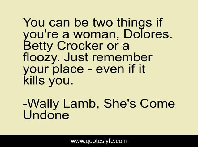 This page presents the quote "You can be two things if you're a woman, Dolores. Betty Crocker or a floozy. Just remember your place - even if it kills you.". Author of this quote is Wally Lamb, She's Come Undone. This quote is about woman, betty-crocker,.