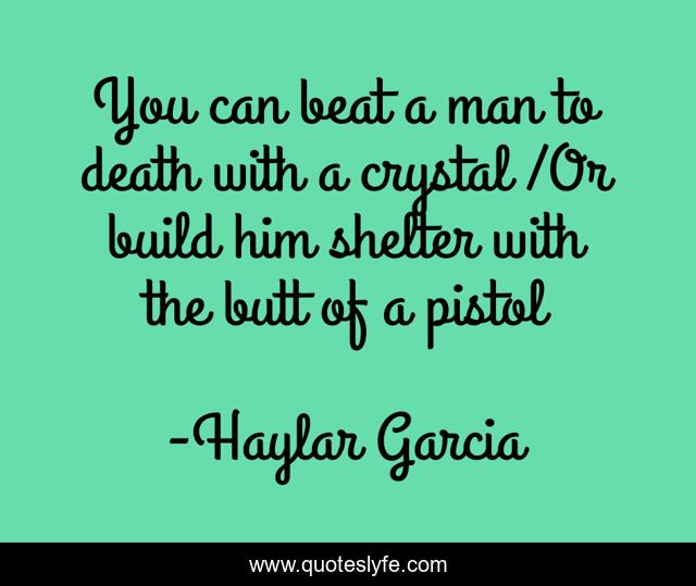 This page presents the quote "You can beat a man to death with a crystal /Or build him shelter with the butt of a pistol". Author of this quote is Haylar Garcia. .