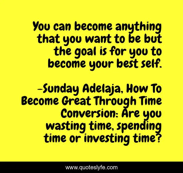 This page presents the quote "You can become anything that you want to be but the goal is for you to become your best self.". Author of this quote is Sunday Adelaja, How To Become Great Through Time Conversion: Are you wasting time, spending time or investing time?. This quote is about life, live-your-best-life, fulfilling-dreams, conversion, productivity, goal, greatness, waste, humanity,.